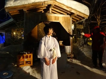 昔氷祭りが開催されるずっと前の秋神温泉に、冬のこんこんと雪の降る中、どこからともなく一人の女性が舞い込んだことがありました。秋神温泉の小林家皆の看病で女性はなんとか元気になり、宿から見送ったそうです。なぜ飛騨高山で最も寒いといわれるこんな山奥に女性が一人で歩いていたのか、なぜ奇跡的に秋神温泉にたどり着けたのか、大変不思議な出来事だったようです。女性を見送った後、山々を眺めていた小林さんは、ふと厳しい冬の環境を活かした「氷のアート」を思いついたそうです。まるで山の神が小林さんに訴えかけるように、ハッと胸が打たれるような感覚になりました。