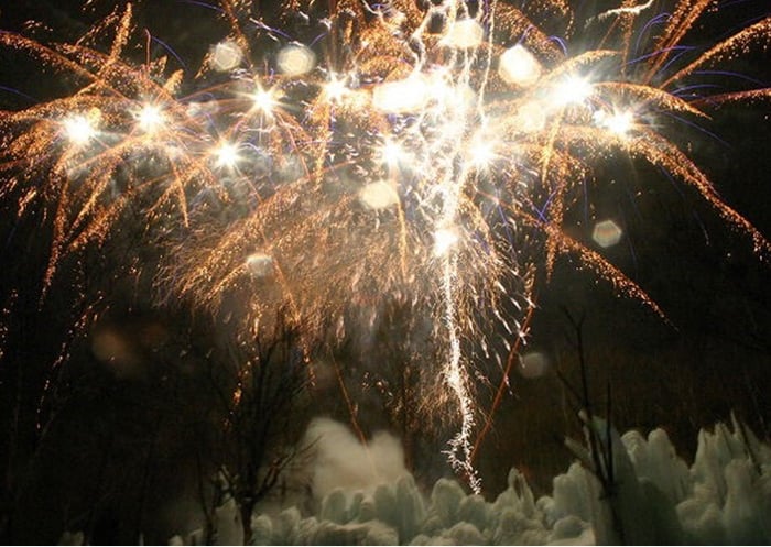 イベントの最後は氷祭り名物の冬の大花火が打ち上げられます。氷点下の森の夜空は周りが森に囲まれている為、夜空が非常に狭く感じます。その夜空に打ち上げられる花火はとても綺麗で迫力満点。花火の爆音が山々にこだまし、山中に花火の音が響き渡ります。氷と花火のコラボレーションが大変ご来場者様からご好評いただいております。