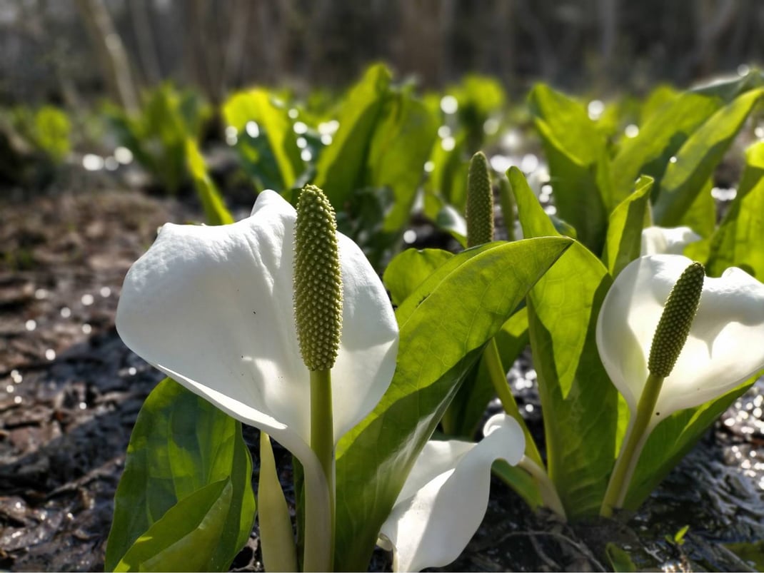 5月初旬になりますと、早い時期に咲いた水芭蕉の見頃は終わり、比較的遅咲きの水芭蕉は見頃を迎えます。日光の当たり具合で咲き始めが変わりますので、4月中旬~5月初旬までの長い期間で水芭蕉が楽しめます。