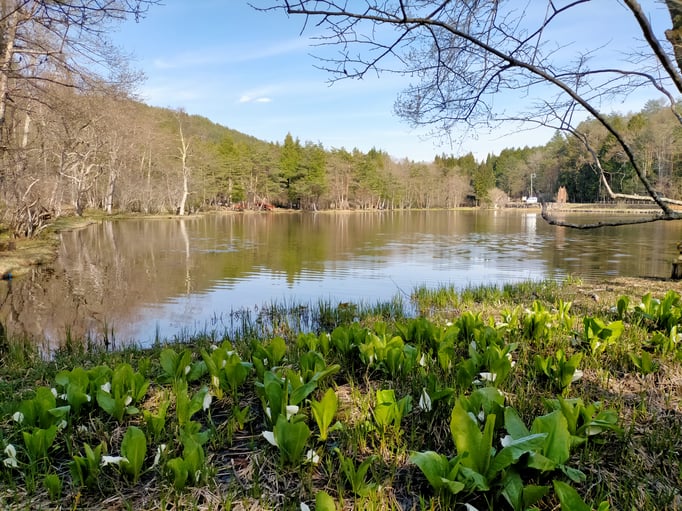 美女高原キャンプ場の美女が池周辺に自生する水芭蕉の数は約1万株と言われています。