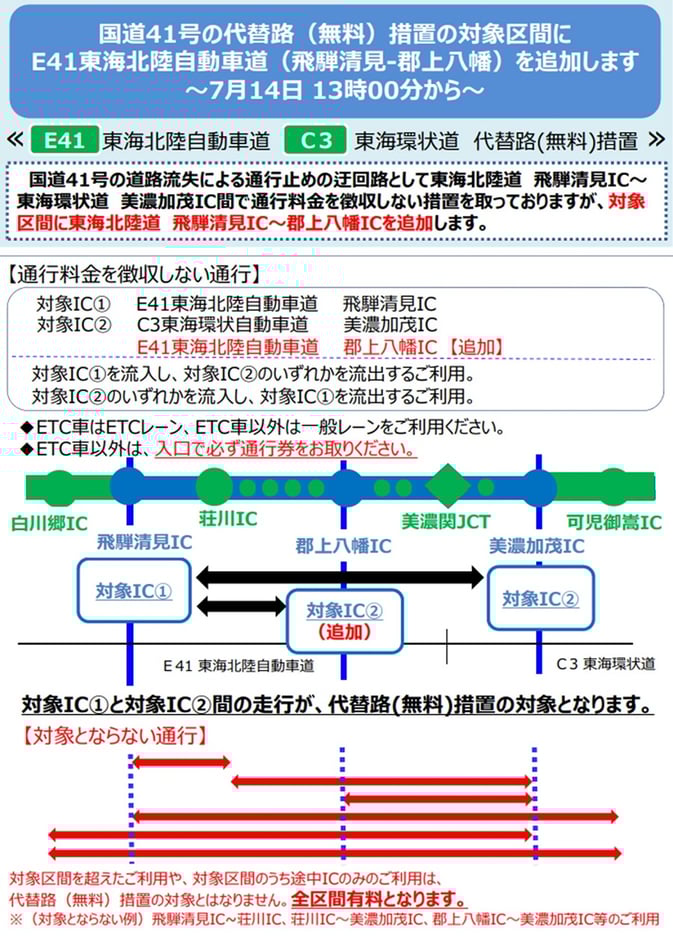 2020年7月 · 17日 7月 2020 国道41号代替路(無料)のご案内 現在国道41号の一部が大雨被害により交通できない状況です。国道41号の代替路(無料)の案内を致しますので、飛騨高山・飛騨あさひにお越しの際はこちらをご利用下さい。 tagPlaceholderカテゴリ: