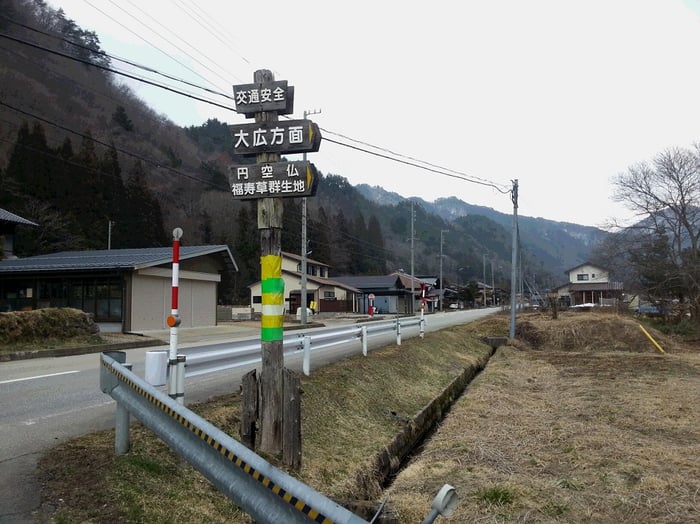国道361号線を高山市内方面から長野県に向かい、大広地区の看板を右折してください。100mほどで「りゅうあんばし」がありますので、その橋を渡ってすぐ左手の土手にあります。駐車場はありませんので、お車を停める時は十分注意をいて下さい。橋を越えて突き当たりを右折していただくと「円空仏」が祀られています。朝日町には数多くの円空仏がありますが、公開しているのは僅かです。是非そちらもご覧下さい。