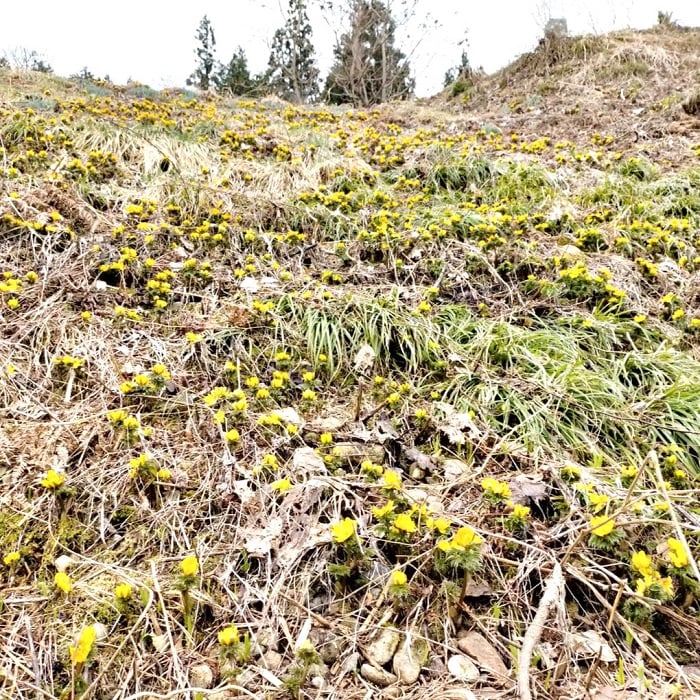 朝日町大広地区、大広公民館横の土手の福寿草が元気に咲いてます(*^^)v もう少しで見頃は終わります。
