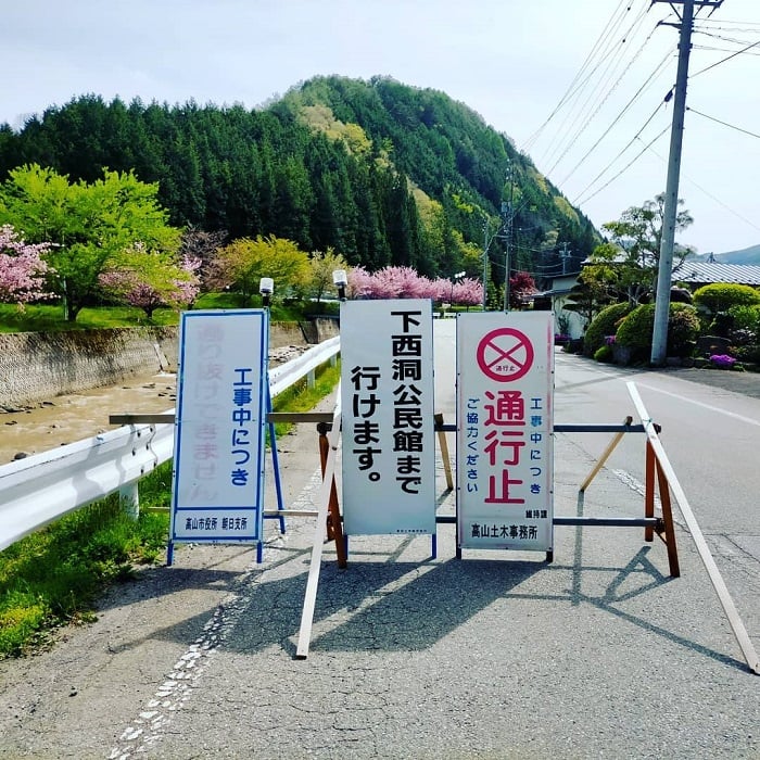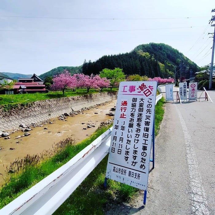 という訳で、八重桜はきれいですが、西洞区の豪雨災害復旧作業につき、メイン道路は通行止めとなっています。迂回路がありますので、通り抜けは可能です。