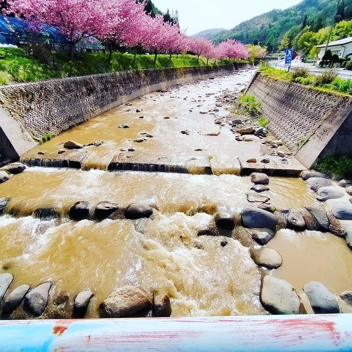 高山市朝日町西洞に流れる西洞川の八重桜が見頃を迎えています。