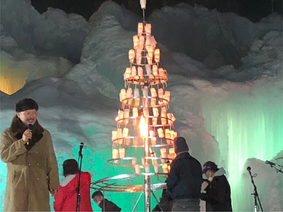 会場にみえた来場者の小さな「愛と平和」を少しづつ集めることが出来ないか、一人一人の願いを世界中に伝えることはできないか、見える形で表現できないか。氷祭りでは数年前から、全ての来場者の心を一つに願いを込める「ハッピーキャンドルタワー」を考え、今回の氷祭りでも実施しました。