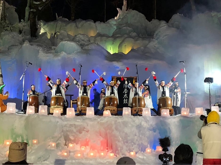 コロナ前に出演していただいた陣屋太鼓さん。3年越しのステージです。氷点下の森と太鼓のコラボ、氷の夜空に広がる太鼓の音、このおかげでお祭りがどんどん盛り上がっていくのを感じました。